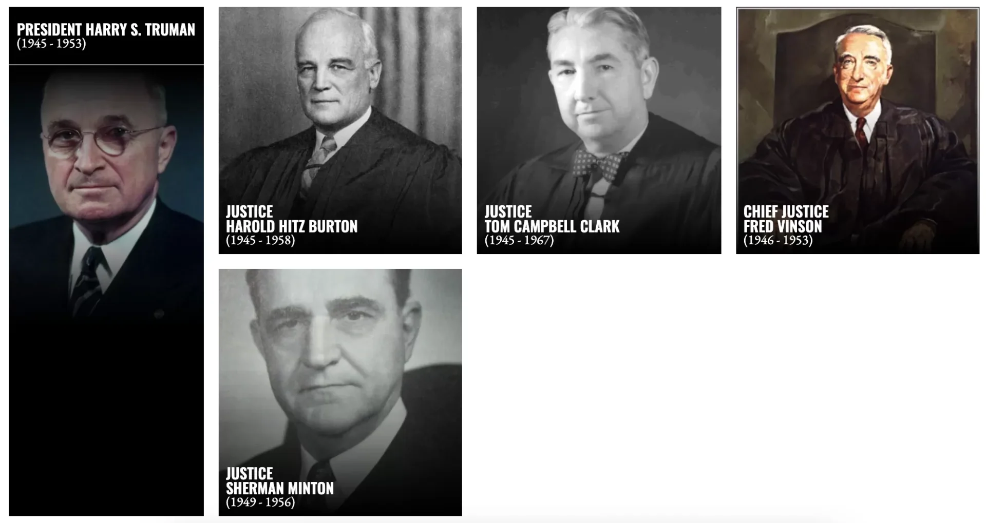 President Truman, who had taken over the presidency after the sudden death of President Franklin D. Roosevelt, wasted no time in making his mark on the highest court of the land. In his first term as President, he would make four appointments to the Supreme Court, including Chief Justice Fred M. Vinson and Justices Harold H. Burton, Tom C. Clark, and Sherman Minton.