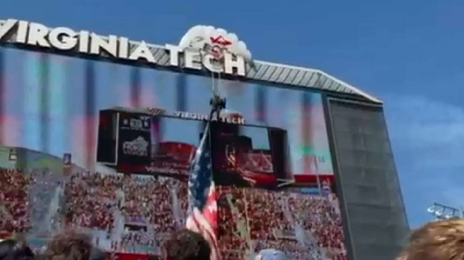 WATCH: Skydiver slams into Virginia Tech scoreboard, dangles by parachute